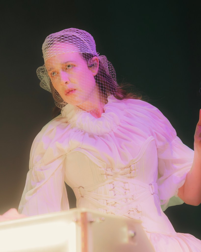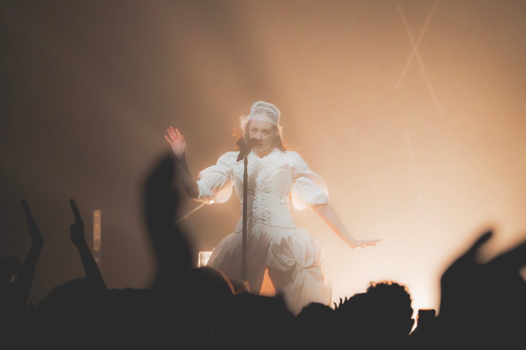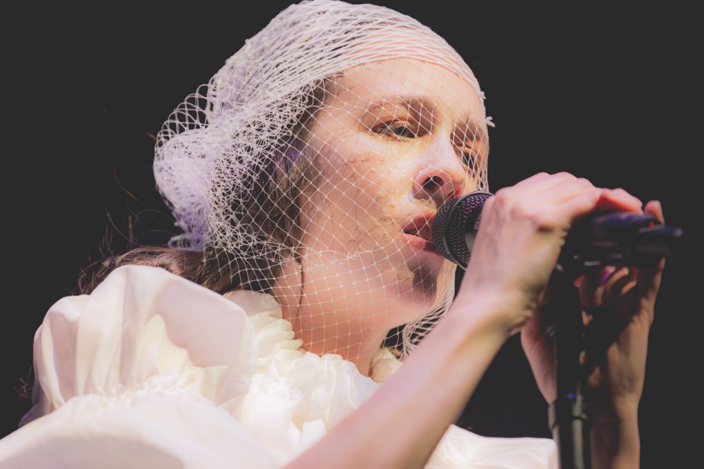 She did not reveal her face until the second song, and even then her face was covered in a white fishnet veil with white mascara’d eyelashes poking through. She vividly contrasted the dim lit crowd in her sheer white Victorian dress. It was styled in a refreshing modern fashion: ripped, hiked up, and a tight corset accentuating her femme fatale.